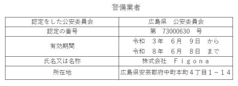 | 警備業の認定 | 広島県公安委員会 第73000630号 |